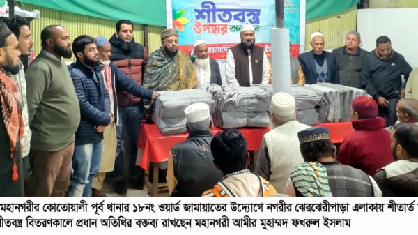 ওয়ার্ড সভাপতি মো. আব্দুল মোতালেবের সভাপতিত্বে ও সেক্রেটারী নূরুল ইসলাম ফয়সালের পরিচালনায় অনুষ্ঠিত শীতবস্ত্র বিতরণ অনুষ্ঠানে বিশেষ অতিথি হিসেবে উপস্থিত ছিলেন, কোতোয়ালী পূর্ব থানার আমীর সহকারী অধ্যাপক রফিকুল ইসলাম মজুমদার।