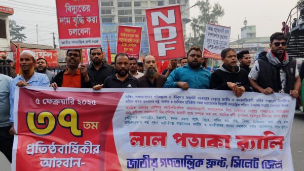 » জাতীয় গণতান্ত্রিক ফ্রন্টের প্রতিষ্ঠাবার্ষিকীতে সিলেটে লাল পতাকা র্যালি ও সমাবেশ