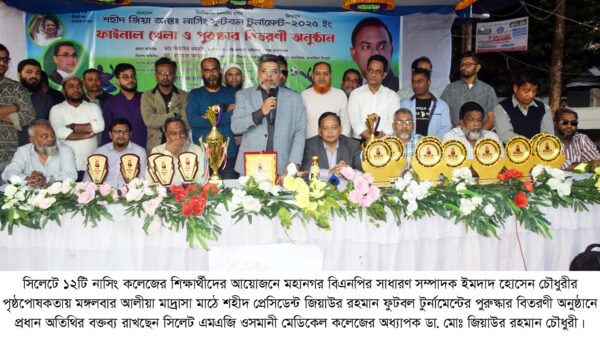 সিলেট নাসিং কলেজ এসোসিয়েশনের উদ্যোগে সিলেটে ১২টি নাসিং কলেজের শিক্ষার্থীদের নিয়ে ব্যাতিক্রমীভাবে এই প্রথম সিলেটে সোমবার (২৪ ফেব্রুয়ারি) আলীয়া মাদ্রাসা মাঠে মহানগর বিএনপির সাধারণ সম্পাদক ইমদাদ হোসেন চৌধুরীর পৃষ্ঠপোষকতায় শহীদ প্রেসিডেন্ট জিয়াউর রহমান ফুটবল টুর্নামেন্টের পুরুস্কার বিতরণী অনুষ্ঠান অনুষ্ঠিত হয়।