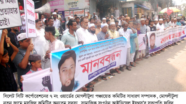 মোগলীটুলা পঞ্চায়েত কমিটির সভাপতি ও মোগলীটুলা নতুন জামে মসজিদ কমিটির মোতাওয়াল্লী কাজী মইনুল হোসেনের সভাপতিত্বে এবং সামাজিক সংগঠন আইডিয়েল ইয়থস্’র সাধারণ সম্পাদক ইকবাল হোসেন বাচ্চু’র পরিচালনায় মানববন্ধনে বক্তব্য রাখেন ও উপস্থিত ছিলেন, মোগলীটুলা পঞ্চায়েত কমিটির সহ-সভাপতি মানিক মিয়া, আব্বাসী জামে মসজিদের মোতাওয়াল্লী কাজী নুরুল ইসলাম চৌধুরী, বিশিষ্ট ব্যবসায়ী কবির আহমদ, লাল সবুজ সমাজ কল্যাণ সংঘের সাধারণ সম্পাদক ডা. তানভীর আহমদ, সবিশিষ্ট সমাজকর্মী সুজন আহমদ, ৭নং ওয়ার্ডের সাবেক কাউন্সিলর সাইদ আবদুল্লাহ, বিশিষ্ট ক্রীড়ানুরাগী দেলওয়ার আহমদ, বিশিষ্ট ব্যবসায়ী সিরাজ উদ্দিন, বিশিষ্ট ব্যবসায়ী আব্দুল গফুর, ওমর কাঠগর সংস্থা সহ-সভাপতি ছমির আহমদ, সমাজসেবক লায়েক আহমদ, নিসচা’র কেন্দ্রীয় সাংগঠনিক সম্পাদক জহিরুল ইসলাম মিশু, আইডিয়েল ইয়থস্’র সহ-সভাপতি মুমিন আহমেদ, ভারপ্রাপ্ত সভাপতি মোহাম্মদ নিজাম উদ্দিন, সাবেক সভাপতি মাহবুব মুর্শেদ, সমাজসেবক খোকন আহমেদ, বিশিষ্ট ব্যবসায়ী আতিক খান, মোগলীটুলা নতুন জামে মসজিদ কমিটির সদস্য জুবের আহমদ, সমাজসেবক জহির হোসেন, আইডিয়েল ইয়থস্’র কার্যকরী কমিটির সদস্য কাউসার খান, কার্যকরী কমিটির সদস্য ইমাদ উদ্দিন আহমদ চৌধুরী, সাবেক সাধারণ সম্পাদক জনি আহমদ, হাজীপাড়া জামে মসজিদ কমিটির সদস্য জুয়েল আহমদ প্রমুখ।