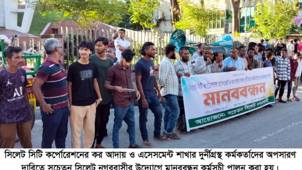 সিলেট সিটি কর্পোরেশনের কর আদায় ও এসেসমেন্ট শাখার দুর্নীগ্রস্থ কর্মকর্তাদের অপসারণ ও ৪২নং ওয়ার্ডে সহনীয় পর্যায়ে গৃহকর নির্ধারণের দাবিতে সচেতন সিলেট নগরবাসীর উদ্যোগে এক মানববন্ধন কর্মসূচী বৃহস্পতিবার (৪ সেপ্টেম্বর) বিকেল ৪টায় সিলেট কেন্দ্রীয় শহীদ মিনার এলাকায় অনুষ্ঠিত হয়।