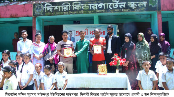 সিলেটের দক্ষিণ সুরমার দাউদপুর ইউনিয়নের দাউদপুর দিশারী কিন্ডার গার্টেন স্কুলের উদ্যোগে প্রবাসী ৩ জন শিক্ষানুরাগীকে সংবর্ধনা প্রদান করা হয়েছে।