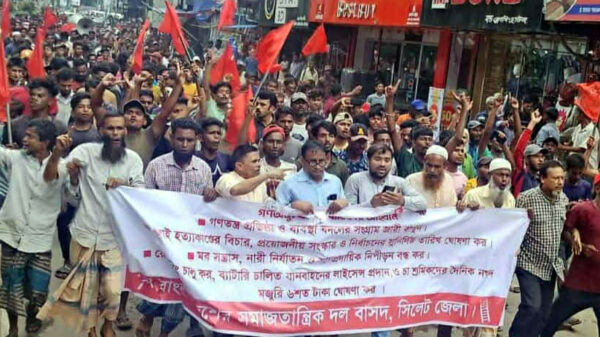 প্রয়োজনীয় সংস্কার সম্পন্ন করে দ্রুত নির্বাচনের তারিখ ঘোষণা,মব সন্ত্রাস-নারী নির্যাতন-সাম্প্রদায়িক নিপীড়ন বন্ধ, দ্রুব্যম্যূল্যের নিয়ন্ত্রণ, ব্যাটারি চালিত যানবাহনের লাইসেন্স প্রদান ও চা শ্রমিকদের দৈনিক নগদ মজুরি ৬ শত টাকা ঘোষণার দাবিতে বাসদ সিলেট জেলা শাখার মিছিল ও সমাবেশ অনুষ্ঠিত হয়।