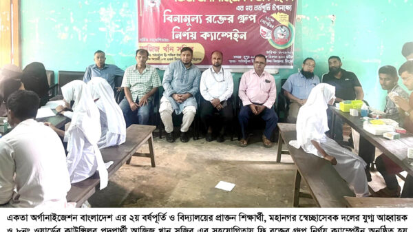 একতা অর্গানাইজেশন বাংলাদেশ এর ২য় বর্ষপূর্তি ও বিদ্যালয়ের প্রাক্তণ শিক্ষার্থী, মহানগর স্বেচ্ছাসেবক দলের যুগ্ম আহ্বায়ক ও ৮নং ওয়ার্ডের কাউন্সিলর পদপ্রার্থী আজিজ খান সজিব এর সহযোগিতায় ফ্রি রক্তের গ্রুপ নির্ণয় ক্যাম্পেইন-২০২৫ অনুষ্ঠিত হয়েছে।