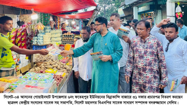 সিলেট-০৪ আসনের গোয়াইনঘাট উপজেলার ৬নং ফতেহপুর ইউনিয়নের বিন্নাকান্দি বাজারে মঙ্গলবার (৩০ সেপ্টেম্বর) বিএনপির ভারপ্রাপ্ত চেয়ারম্যান ঘোষিত রাষ্ট্রকাঠামো মেরামতের ৩১ দফার প্রচারপত্র বিতরণ করেন, ছাত্রদল কেন্দ্রীয় সংসদের সাবেক সহ সভাপতি, সিলেট মহানগর বিএনপির সাবেক সাধারণ সম্পাদক বদরুজ্জামান সেলিম।