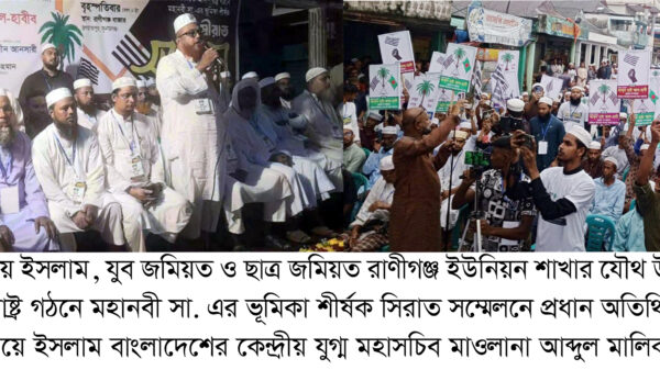 জমিয়ত উলামায়ে ইসলাম, যুব জমিয়ত ও ছাত্র জমিয়ত রাণীগঞ্জ ইউনিয়ন শাখার যৌথ উদ্যোগে ইনসাফ ভিত্তিক আদর্শ রাষ্ট্র গঠনে মহানবী (সা.) এর ভূমিকা শীর্ষক সিরাত সম্মেলন বৃহস্পতিবার (২ অক্টোবর) স্থানীয় রানিগঞ্জ বাজারে অনুষ্ঠিত হয়।