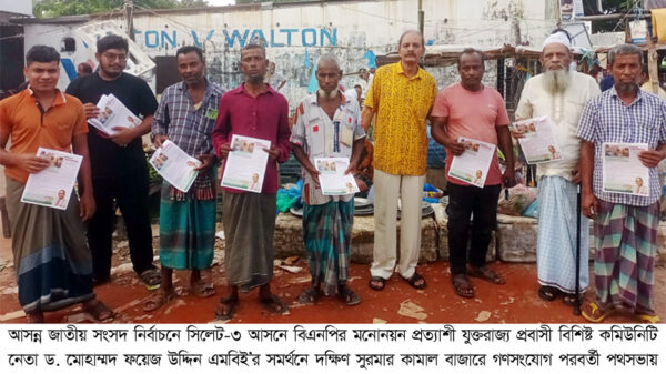 আসন্ন জাতীয় সংসদ নির্বাচনে সিলেট-৩ আসনে বাংলাদেশ জাতীয়তাবাদী দল (বিএনপি)’র মনোনয়ন প্রত্যাশী যুক্তরাজ্য প্রবাসী বিশিষ্ট কমিউনিটি নেতা ড. মোহাম্মদ ফয়েজ উদ্দিন এমবিই’র সমর্থনে দক্ষিণ সুরমার বিভিন্ন স্থানে গণসংযোগ, লিফলেট বিতরণ ও পথসভা অনুষ্ঠিত হয়েছে।