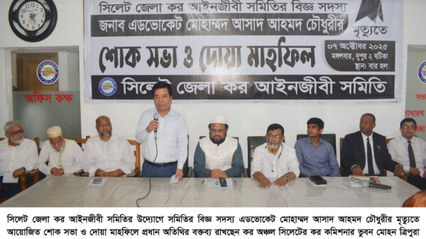 সিলেট জেলা কর আইনজীবী সমিতির উদ্যোগে সমিতির বিজ্ঞ সদস্য এডভোকেট মোহাম্মদ আসাদ আহমদ চৌধুরীর মৃত্যুতে মঙ্গলবার (৭ অক্টোবর) দুপুরে মেন্দিবাগস্থ বার হলে এক শোক সভা ও দোয়া মাহফিল অনুষ্ঠিত হয়।