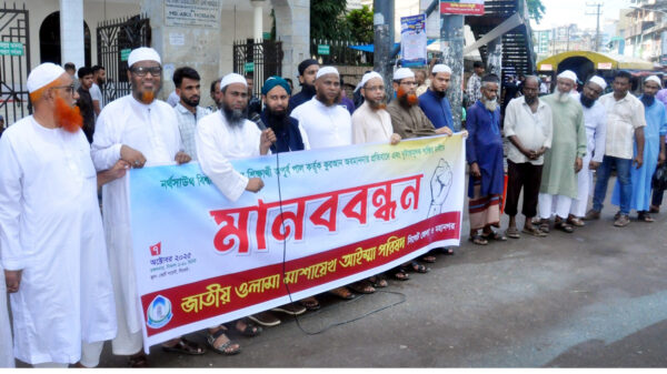মঙ্গলবার (৭ অক্টোবর) বিকেলে সিলেট নগরীর কোর্ট পয়েন্টে কেন্দ্রীয় কর্মসূচির অংশ হিসেবে জাতীয় উলামা মাশায়েখ আইম্মা পরিষদ সিলেট জেলা ও মহানগর শাখার উদ্যোগে এই মানববন্ধন কর্মসূচী অনুষ্ঠিত হয়।