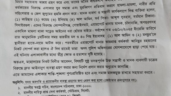 রবিবার (২৬ অক্টোবর) সকালে পুলিশ কমিশনার সিলেট বরাবর এক স্মারকলিপি প্রদান করেছেন এলাকাবাসী।