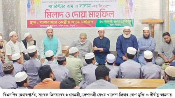 রবিবার (৩০ নভেম্বর) বাদ যোহর সিলেটের দক্ষিণ সুরমার লালাবাজার কেন্দ্রীয় জামে মসজিদে বিএনপির জাতীয় নির্বাহী কমিটির আন্তর্জাতিক বিষয়ক সম্পাদক ও ভারপ্রাপ্ত চেয়ারম্যান তারেক রহমানের মানবাধিকার বিষয়ক উপদেষ্টা ব্যারিস্টার এম এ আব্দুস সালাম এর উদ্যোগে এ মিলাদ ও দোয়া মাহফিল অনুষ্ঠিত হয়।