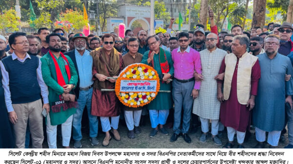 মঙ্গলবার (১৬ ডিসেম্বর) সকালে সিলেট কেন্দ্রীয় শহীদ মিনারে মহান বিজয় দিবস উপলক্ষে মহানগর ও সদর বিএনপির পক্ষ থেকে বীর শহীদদের শ্রদ্ধা নিবেদন শেষে সাংবাদিকদের সাথে আলাপকালে তিনি এসব কথা বলেন।