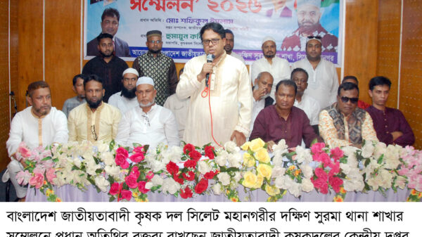 দক্ষিণ সুরমা থানা কৃষকদল নেতা আলী নেওয়াজ খাঁন তুহিনের সভাপতিত্বে ও রিপন মিয়ার পরিচালনায় সম্মেলনে প্রধান অতিথির বক্তব্য রাখেন জাতীয়তাবাদী কৃষক দলের কেন্দ্রীয় দপ্তর সম্পাদক শফিকুল ইসলাম।