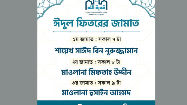 সিলেট নগরীর বন্দরবাজারস্থ ঐতিহ্যবাহী কুদরত উল্লাহ জামে মসজিদে পবিত্র ঈদুল ফিতরের ৩টি জামাত অনুষ্ঠিত হবে।