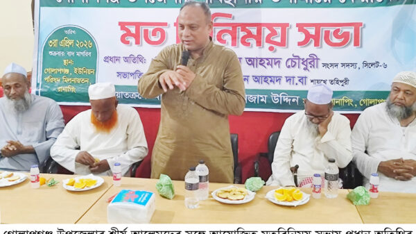 শুক্রবার (৩ এপ্রিল) সন্ধ্যায় গোলাপগঞ্জ ইউনিয়ন পরিষদ মিলনায়তনে অনুষ্ঠিত এ মতবিনিময় সভায় সভাপতিত্ব করেন, মাওলানা লোকমান আহমদ শায়খে তহিপুরী।