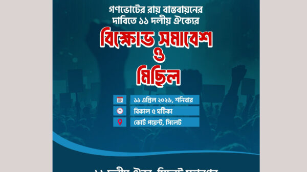 গণভোটের রায় বাস্তবায়নের দাবিতে ও কেন্দ্রীয় কর্মসূচীর অংশ হিসেবে শনিবার (১১ এপ্রিল) বিকেল ৫টায় সিলেট নগরীর কোর্টপয়েন্টে সিলেট মহানগর ১১ দলীয় ঐক্যের উদ্যোগে এক বিক্ষোভ সমাবেশ ও মিছিল অনুষ্ঠিত হবে।