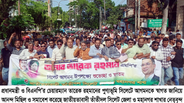 প্রধানমন্ত্রী ও বিএনপি’র চেয়ারম্যান তারেক রহমানের পুণ্যভূমি সিলেটে আগমনকে স্বাগত জানিয়ে আনন্দ মিছিল ও সমাবেশ করেছে জাতীয়তাবাদী তাঁতীদল সিলেট জেলা ও মহানগর শাখার নেতৃবৃন্দ।
