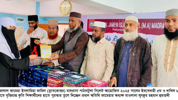 তিনি বৃহস্পতিবার (৩০ এপ্রিল) শাহজালাল জামেয়া ইসলামিয়া কামিল (স্নাতকোত্তর) মাদরাসা পাঠানটুলা সিলেট আয়োজিত ২০২৫ সালের ইবতেদায়ী ৫ম ও দাখিল ৮ম শ্রেণীর ৮৫ জন বৃত্তি প্রাপ্ত শিক্ষার্থীদের সংবর্ধনা অনুষ্ঠানে প্রধান অতিথির বক্তব্যে উপরোক্ত কথাগুলো বলেন।